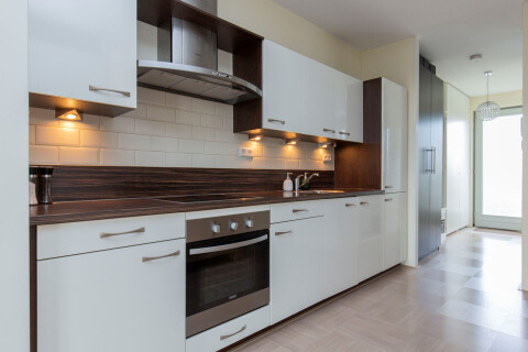 3e verdieping: galerij met uitzicht op de daktuin, toegang tot het appartement met in de hal de meterkast (stadsverwarming en glasvezelkabel), ruime slaapkamer aan de voorzijde waar dubbele deuren aanwezig zijn naar de galerij. Aan de linkerzijde is een badkamer aanwezig voorzien van een ruime open douche ruimte met thermostaatkraan, wastafel en toilet. Verder is aan de linkerzijde een aparte berging aanwezig waar u de wasmachine kunt plaatsen. In het midden van het appartement is een open keuken aanwezig voorzien van een recht opgesteld keukenblok met ingebouwde apparatuur: keramische kookplaat, RVS afzuigkap, koelkast, vriezer en een hete luchtoven.